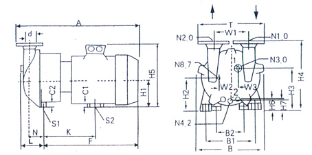 型號 | A | B | B1 | B2 | C1 | C2 | H1 | H2 | H3 | H4 | H5 | H6 | H7 | F | K | L | N | T | S1 | S2 | d1 | d2 | d3 | d4 | d5 | W1 |